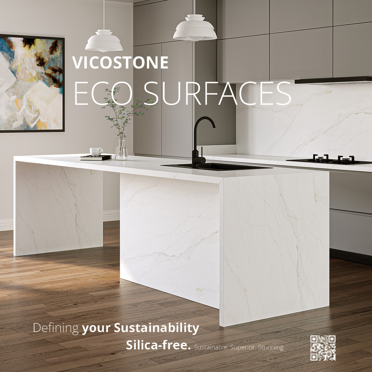 VICOSTONE® ECO Surfaces are a new product line that marks a major leap forward in sustainability and innovation. Crafted through extensive research and development, these surfaces are CRYSTALLINE SILICA-FREE, setting a new standard for safety and environmental responsibility.
